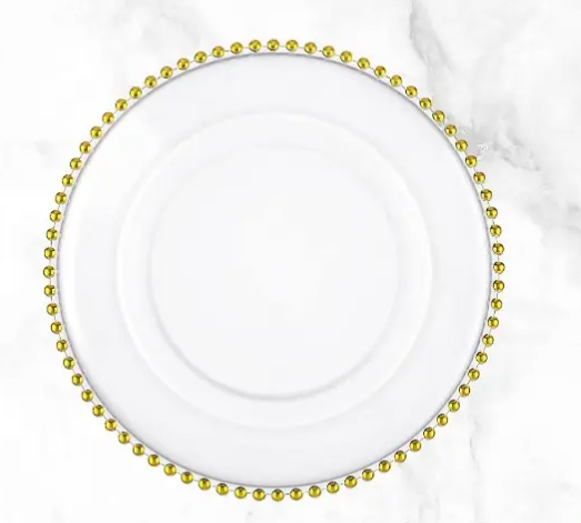 Gold beaded acrylic charger plates hire